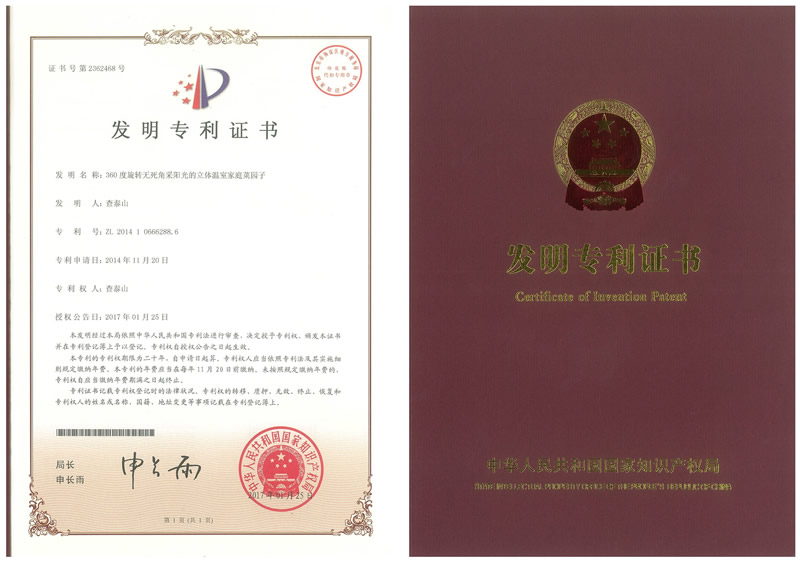 一分田公司查泰山發明的360度旋轉無死角采光立體溫室家庭菜園子,這是發明專利證書